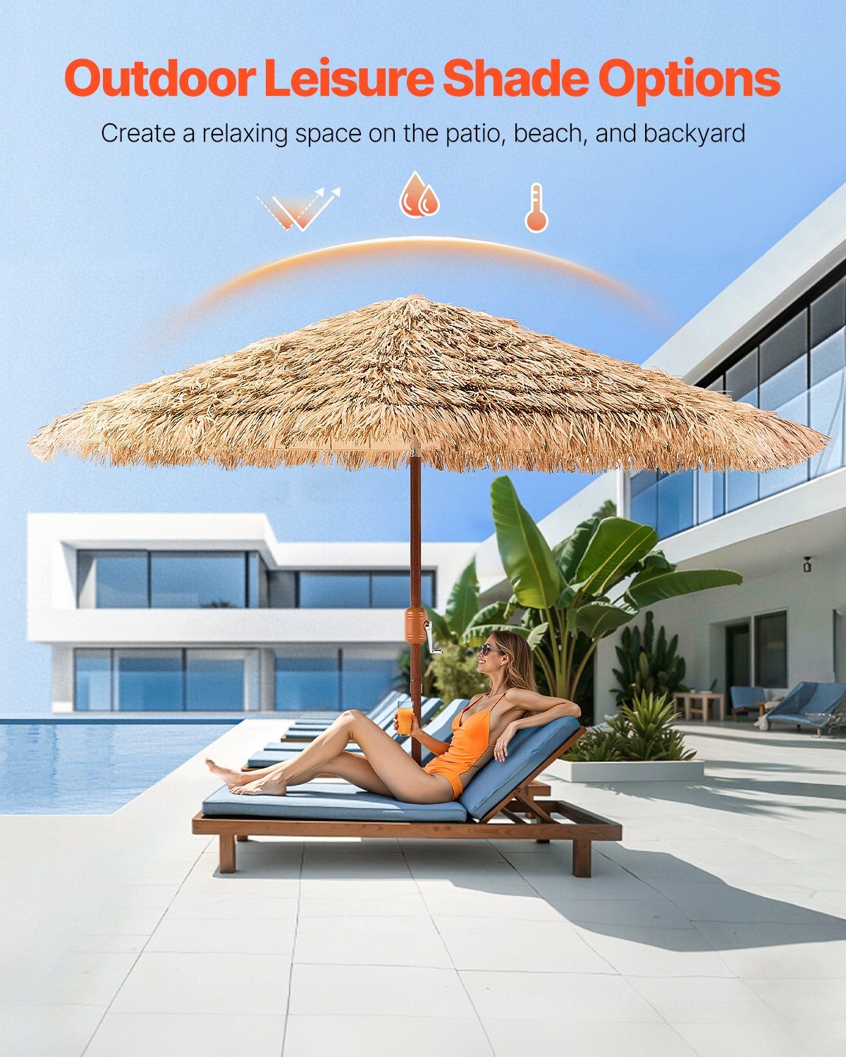 3.Durable Materials: Our thatched umbrella is crafted with a thatch-style exterior and 140g thick breathable polyester fabric for adequate sun protection. Reinforced with 8 spray-coated metal ribs, it ensures long-lasting outdoor performance. Note: Not recommended for use during strong winds or rain