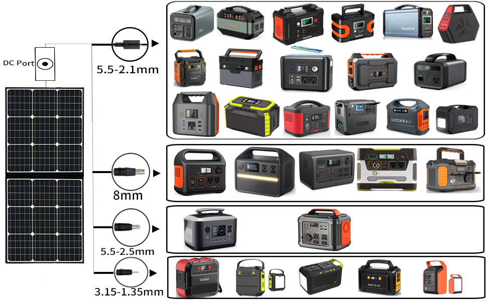 5.5 * 2.1mm DC Adapter for Gofort 200W/330W/600W/1200W; FlashFish 150W/200W/300W; Enginstar R150/R300/R350; GOOLOO P300/P600; ZeroKor; BLUETTI AC200MAX; Anker PowerHouse 200; ALLPOWERS S500/S700/Source; MARBERO 222Wh; ALLWEI 300W; Nexpow YP-300W; AIMTOM SPS-155 portable generator.8mm DC Adapter for Jackery Explorer 160/240/300/500/1000/1500; Anker 521/535/545/Powerhouse II 300/400; Goal Zero Yeti 150/200X/400/500X; BLUETTI EB55/EB70S; BALDR 330W portable generator.3.5 * 1.35mm DC Adapter for Gofort A101; MARBERO 83Wh/167Wh/88Wh; Takki 83Wh portable generator.5.5 * 2.5mm DC Adapter for Suaoki 400Wh portable generator; BigBlue Cellpowa500; VTONCE P302 portable generator.Ideal for outdoor activities such as camping; climbing; hiking; picnic; fishing; rv van trip; etc.